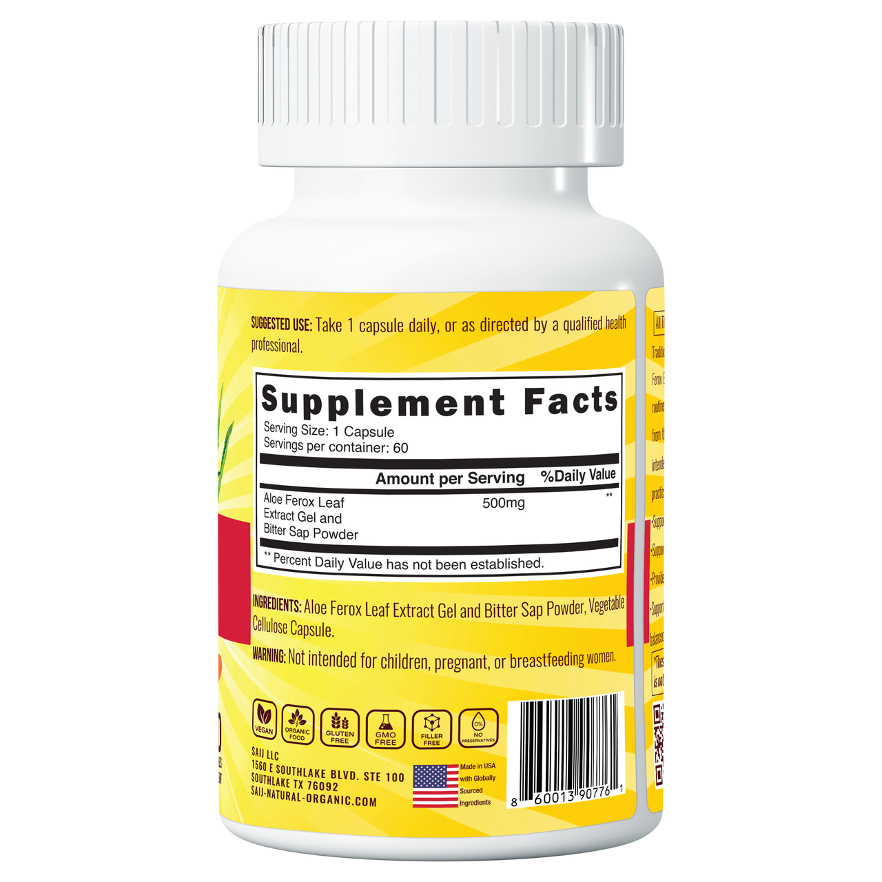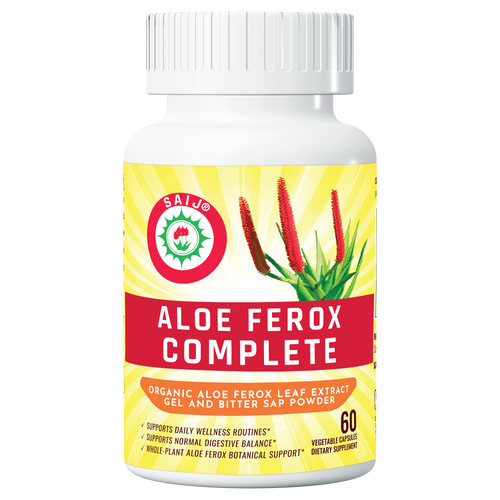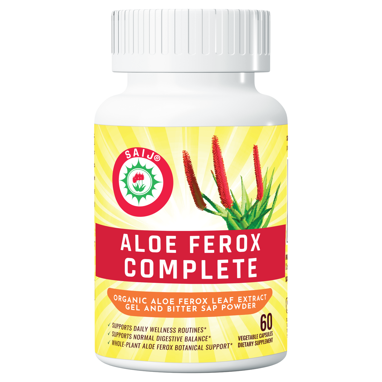 SAIJ Aloe Ferox Complete combines Aloe ferox inner leaf gel powder and Aloe ferox bitter sap powder to provide a comprehensive botanical supplement for adult dietary use.